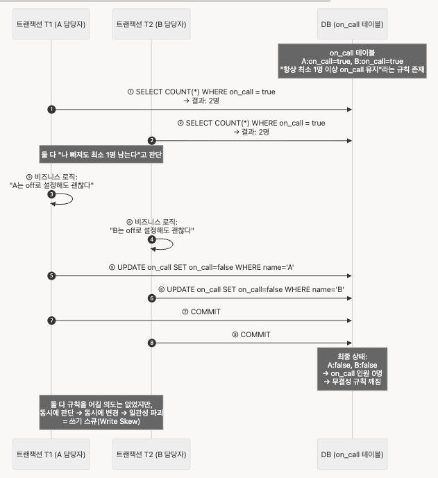 쓰기 스큐란 두 트랜잭션이 서로 다른 두 레코드를 삽입 또는 업데이트하는 것이다. 문제는, 두 트랜잭션이 수행한 로직이 같은 비즈니스 로직을 수행하여 각각의 레코드를 정당하게 업데이트 하였는데 전체적으로 보면 경쟁 조건인것이다. 호출 대기 문제는 아주 좋은 예다. 아래는 두 담당자가 현재 대기 인원이 2명이면 본인은 쉬려고 하는 예제이다. 하지만 두 트랜잭션 모두 최근 스냅샷이 대기 인원이 2명이였기에 둘 모두 off를 할 수 있었다. 하지만 트랜잭션이 모두 커밋된 이후는 대기인원이 아무도 남아있지 않고 최소 조건을 만족하지 않는다.